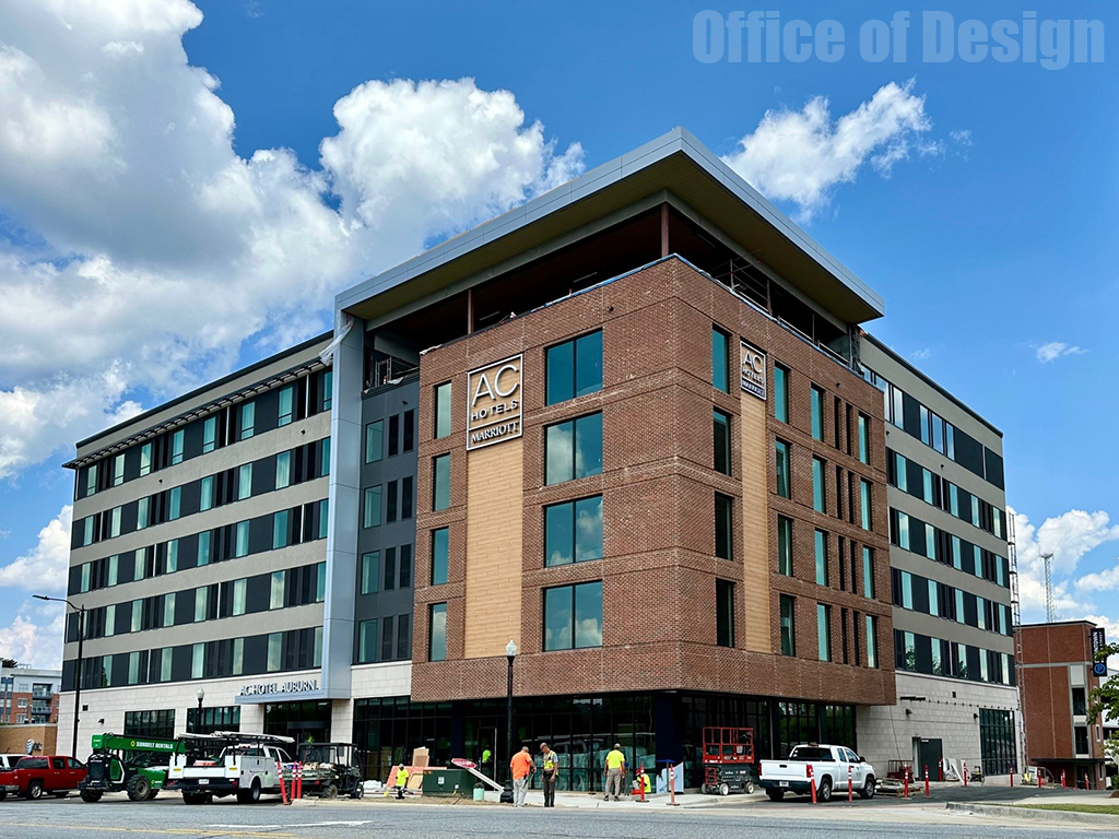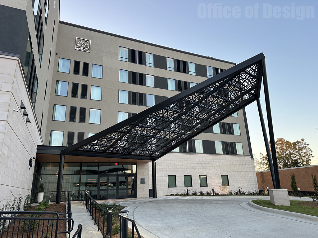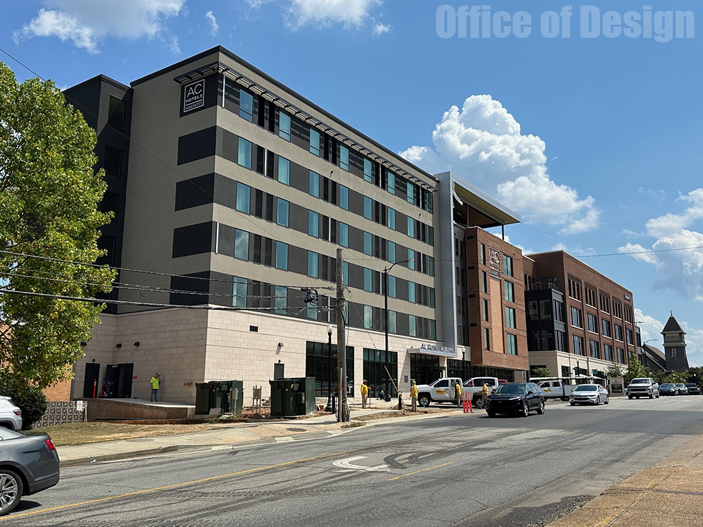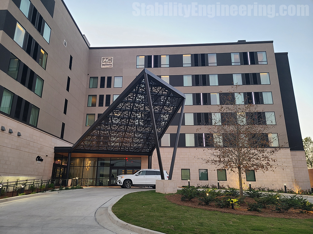 Located in the heart of downtown Auburn, Alabama, the 6-story, 86,000 sf AC Hotel is within walking distance of Auburn University, Toomer’s Corner, and local attractions. The building’s primary structure utilizes post-tensioned (PT) floor and roof plates supported by reinforced concrete walls and columns, paired with a steel-framed roof over the sixth-floor restaurant. Non-bearing cold-formed steel (CFS) walls provide interior and exterior framing flexibility.