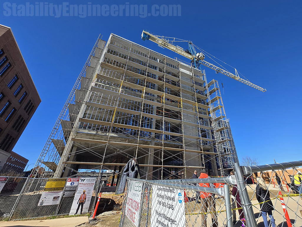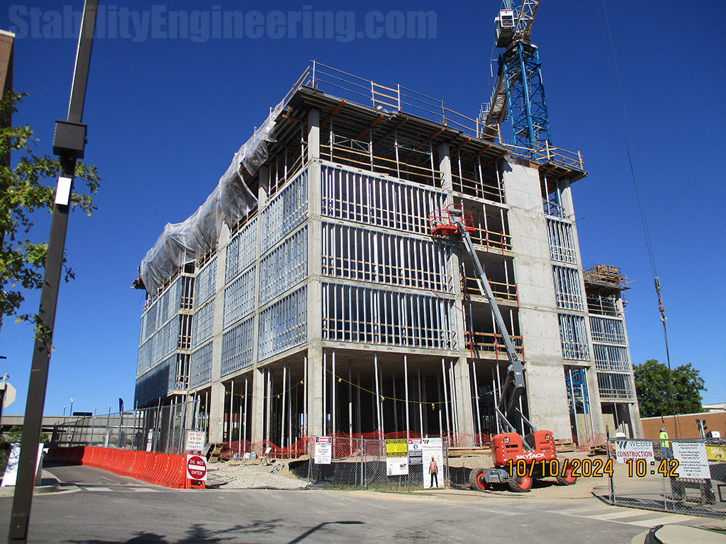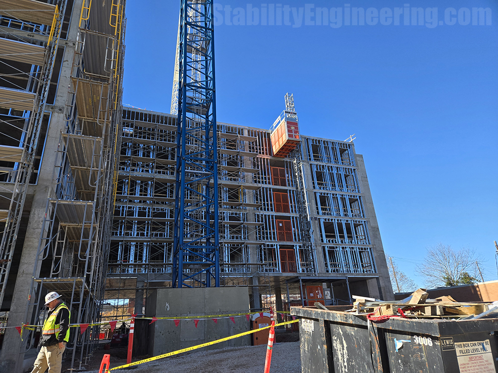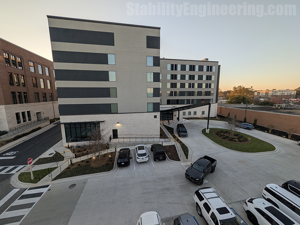 Located in the heart of downtown Auburn, Alabama, the 6-story, 86,000 sf AC Hotel is within walking distance of Auburn University, Toomer’s Corner, and local attractions. The building’s primary structure utilizes post-tensioned (PT) floor and roof plates supported by reinforced concrete walls and columns, paired with a steel-framed roof over the sixth-floor restaurant. Non-bearing cold-formed steel (CFS) walls provide interior and exterior framing flexibility.