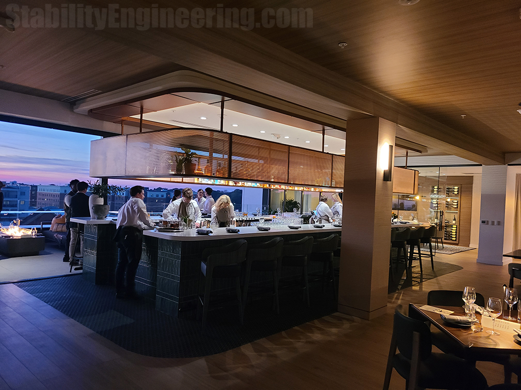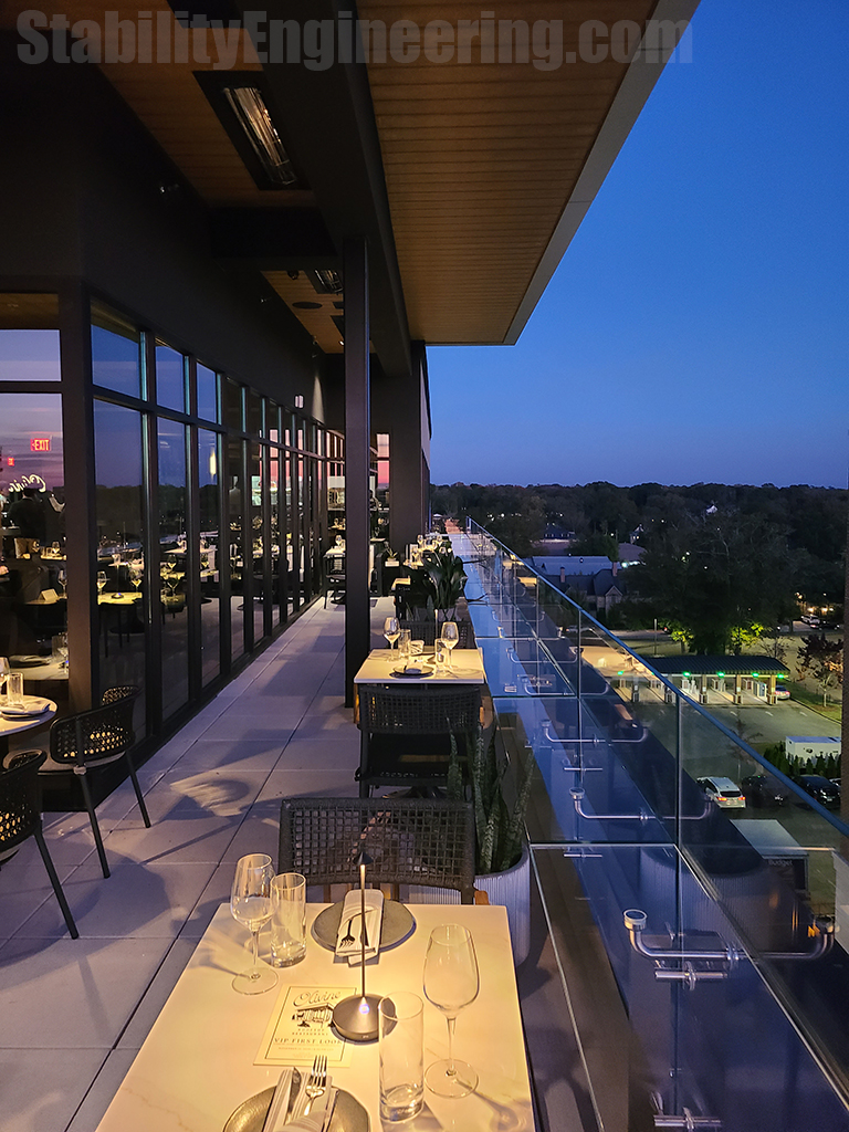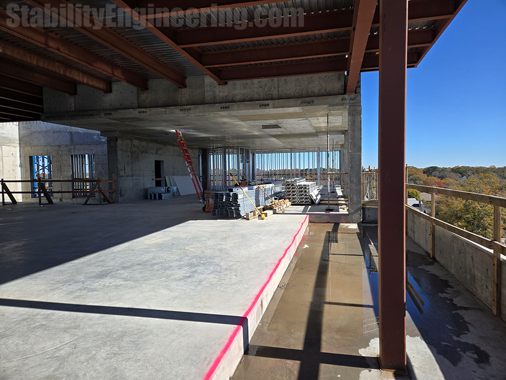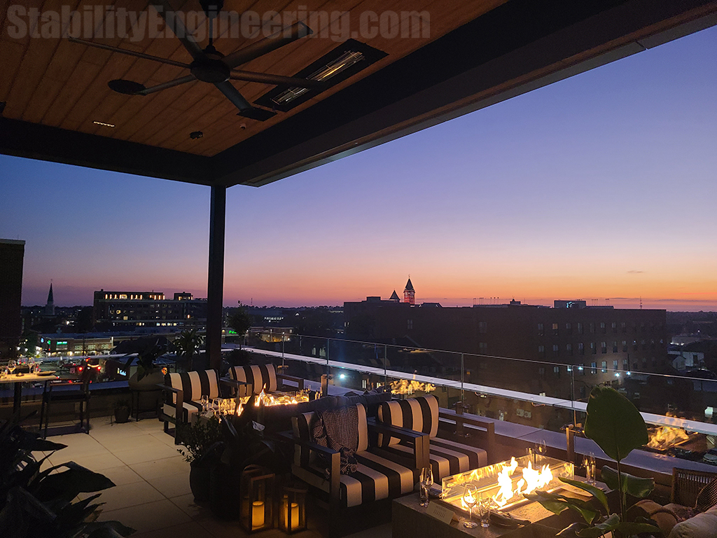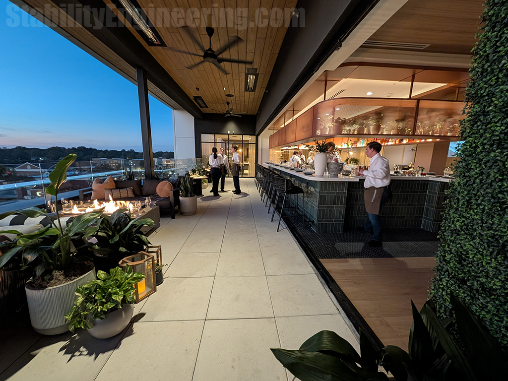 Architectural features drove several unique structural solutions. The cantilevered corner facing the street incorporates slab-supported brick veneer at every level, requiring careful detailing to control movement and maintain alignment. The sixth-floor PT slab was stepped to accommodate an exterior patio with a paver system, integrating seamlessly with the restaurant space and allowing the roof to bear on both the PT roof plates and the slab below.